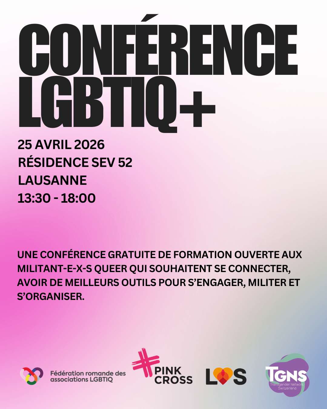 Une conférence gratuite de formation ouverte aux personnes queer qui souhaitent se connecter, avoir de meilleurs outils pour s’engager, militer et s’organiser. Les places sont limitées à 100 personnes pour cette après midi entièrement gratuite. Les inscriptions sont obligatoire pour prendre part. La conférence est organisée par la LOS, Pink Cross, TGNS et le Fédération romande des associations LGBTIQ+.